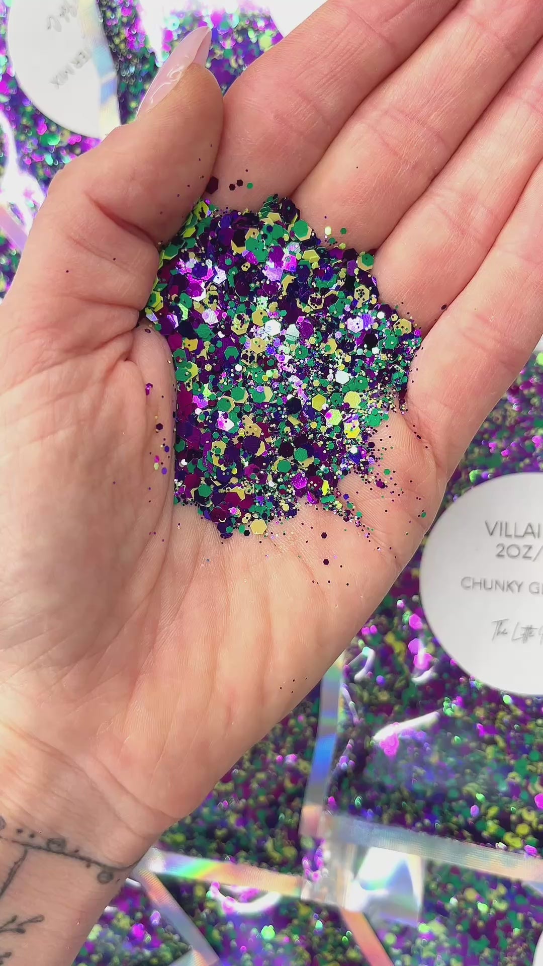 This is a deep purple, deep green and colour-shifting lime green chunky, fine and ultra-fine glitter mix in a 2oz/56g pack.