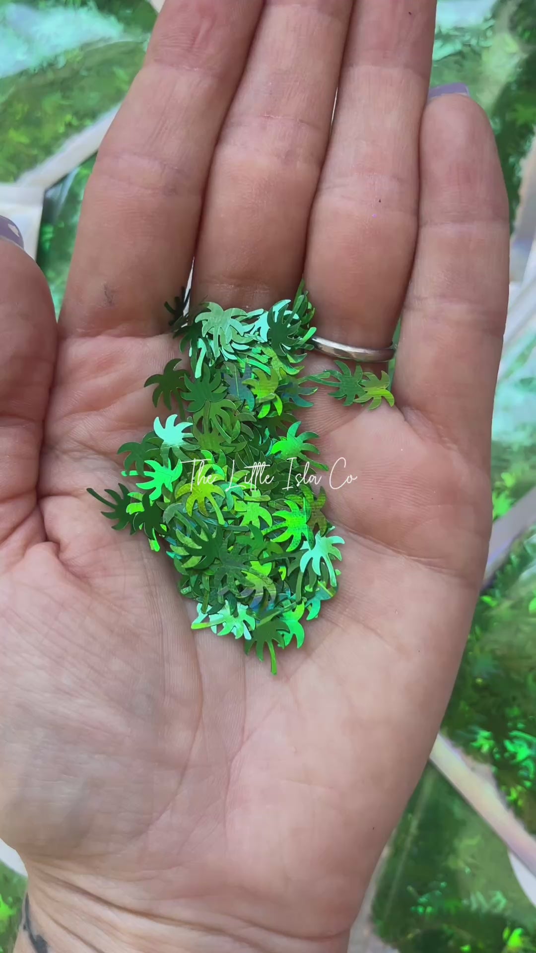 This is a holographic green palm tree-shaped glitter.