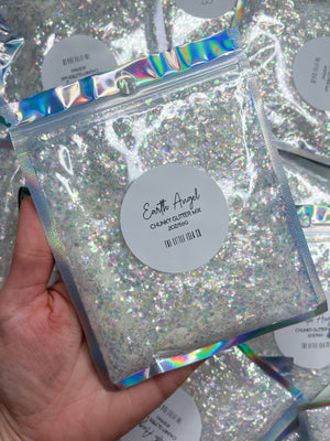 This is a translucent white opal glitter with iridescent rainbow reflects, in a chunky mix of 3-cut sizes.