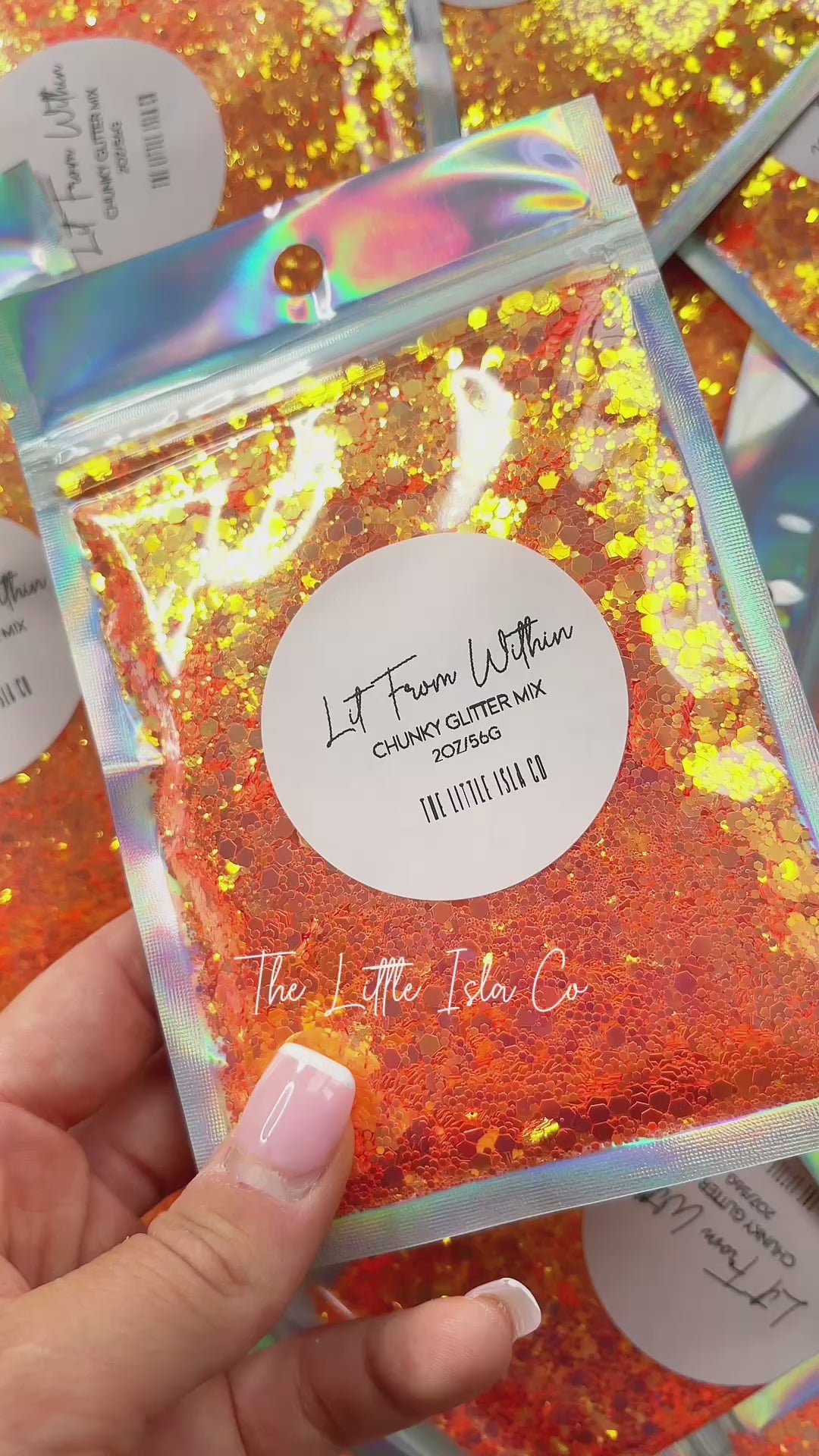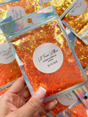 This is a glowy iridescent orange chunky, fine and ultra-fine glitter mix in a 2oz/56g pack.