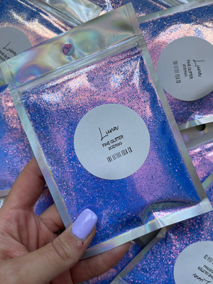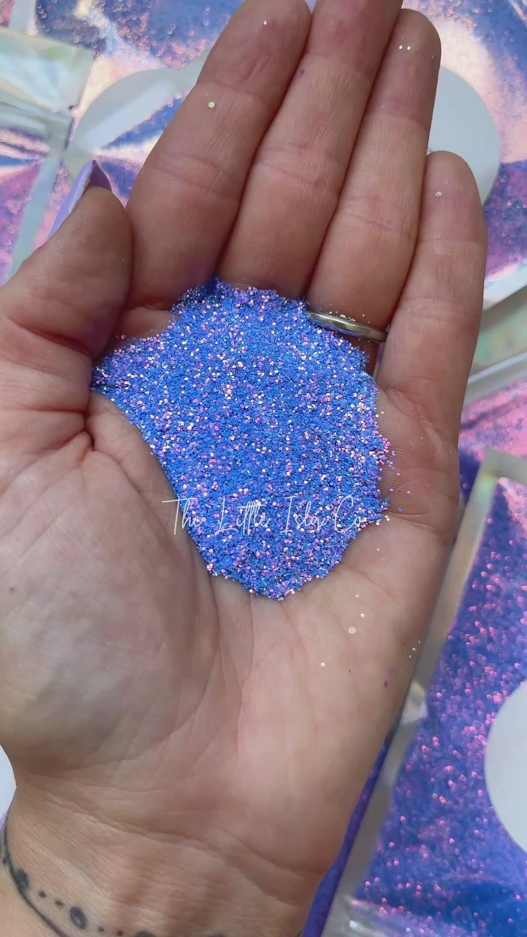 This is a blue-lilac fine glitter with an iridescent finish, in a 2oz/56g pack. It is the SAME COLOUR as the chunky glitter mix with the SAME NAME.