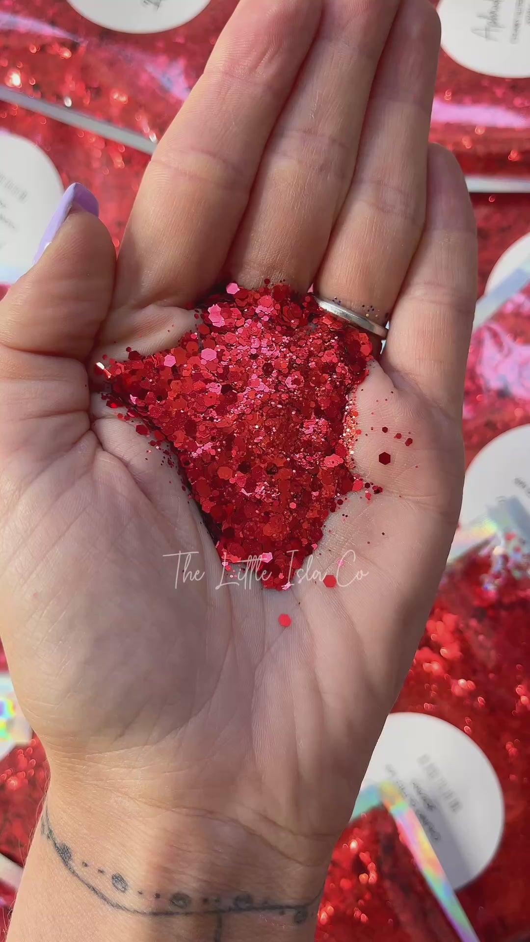 This is a metallic bright ‘blood’ red chunky glitter mix, in a combination of 3 cut sizes - chunky, fine and ultra-fine glitter.