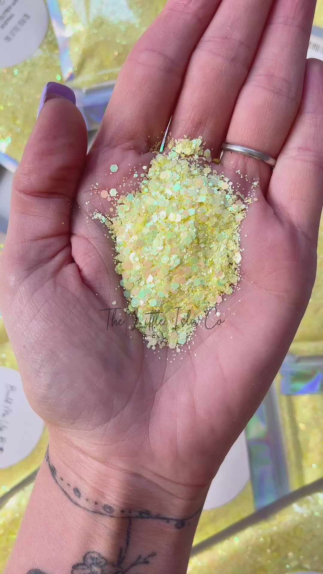 This is an iridescent yellow glitter. This mix has a combination of chunky, fine and ultra-fine glitter.