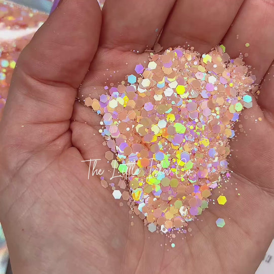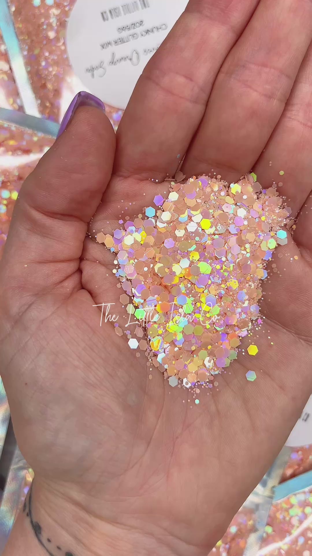 A bit of nostalgia with this pastel peachy orange glitter in a chunky, fine and ultra-fine glitter mix.