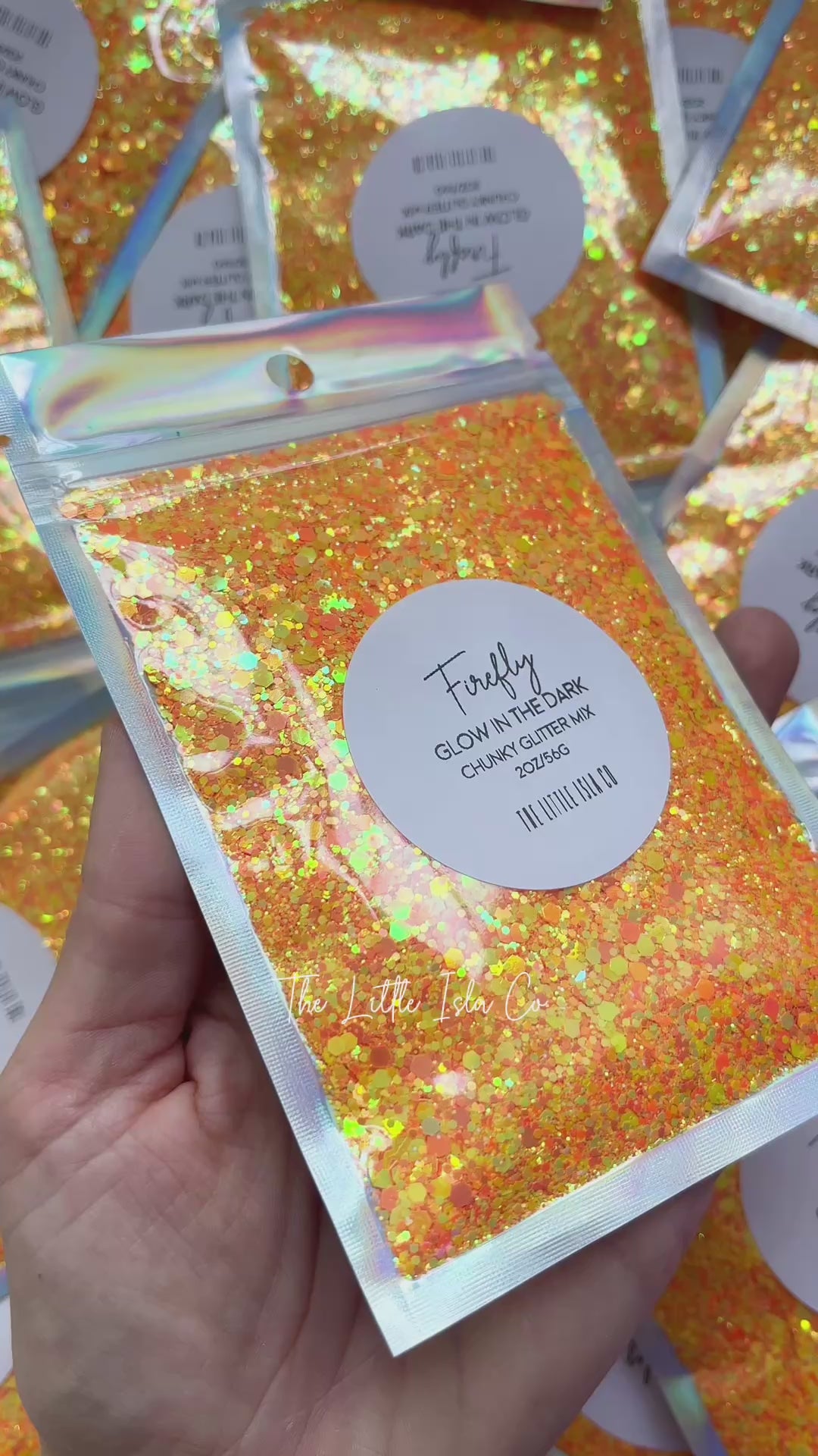 This is a glow in the dark orange glitter (glows orange) in a chunky, fine and ultra-fine mix.