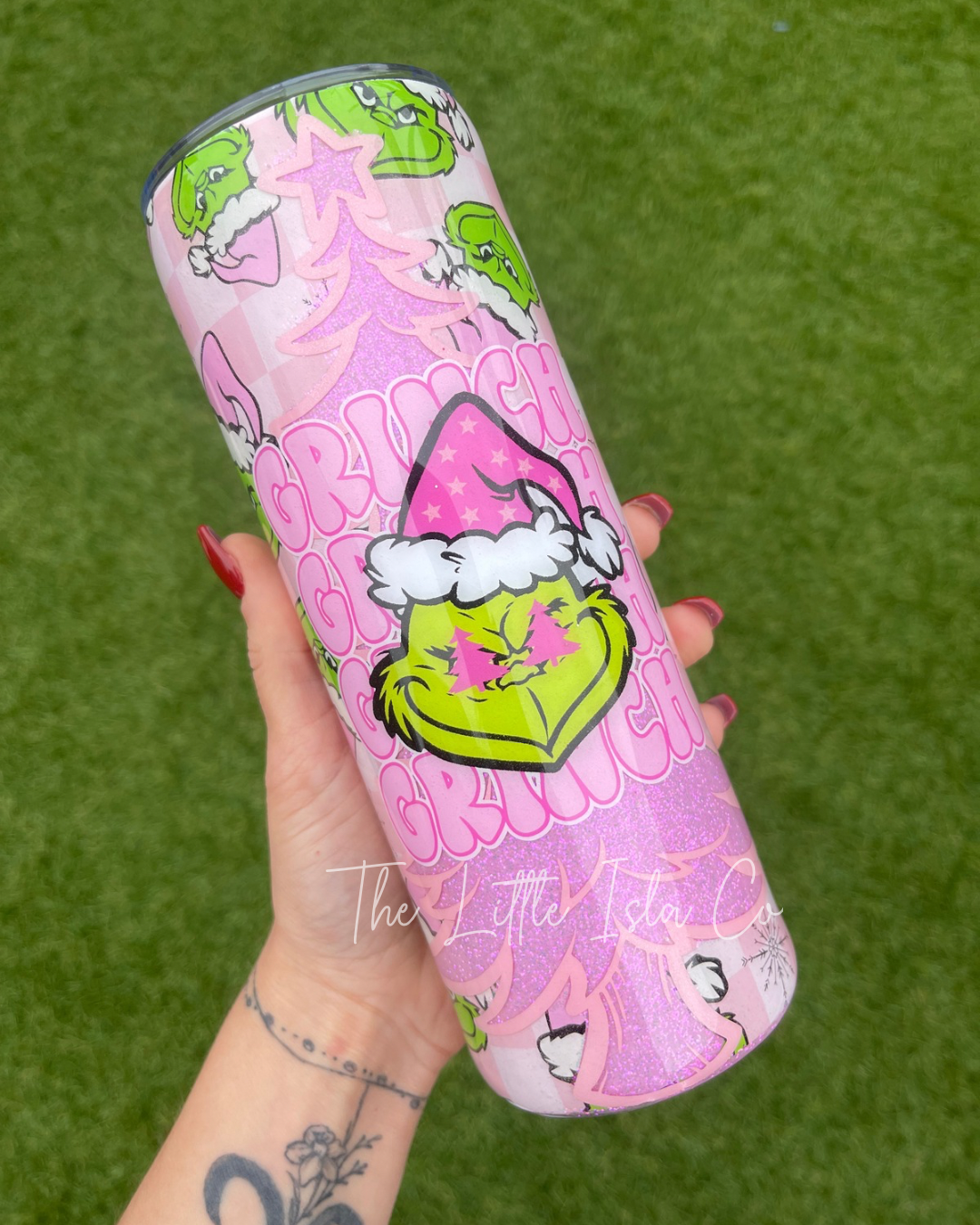 Featuring The Little Isla Co glitter, and the well-known ‘mean’ green character print in the pink variant, a Christmas tree cut-out & vinyl overlay, filled with glitter and finished with a matching decal in the centre of the Christmas tree.