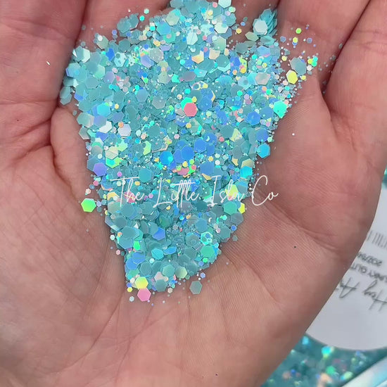 This is a holographic pastel blue glitter in a chunky, fine and ultra-fine glitter mix.