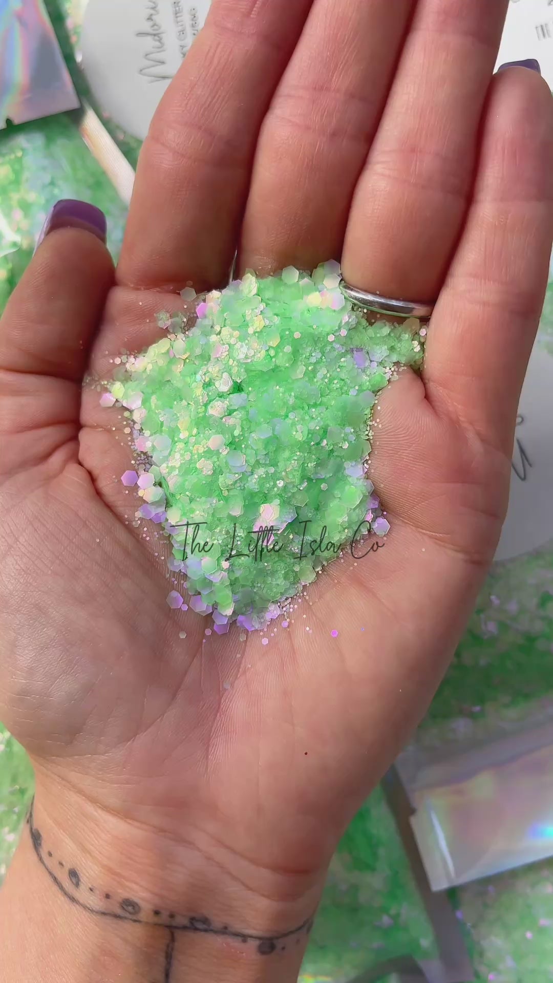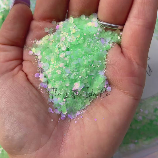 This is a pastel mint green glitter with a prismatic sparkle (similar to my Magic Sparkle Enhancer glitters) so it adds a stunning orange shine as well as an iridescent shift.