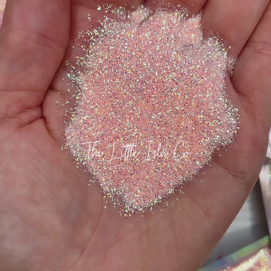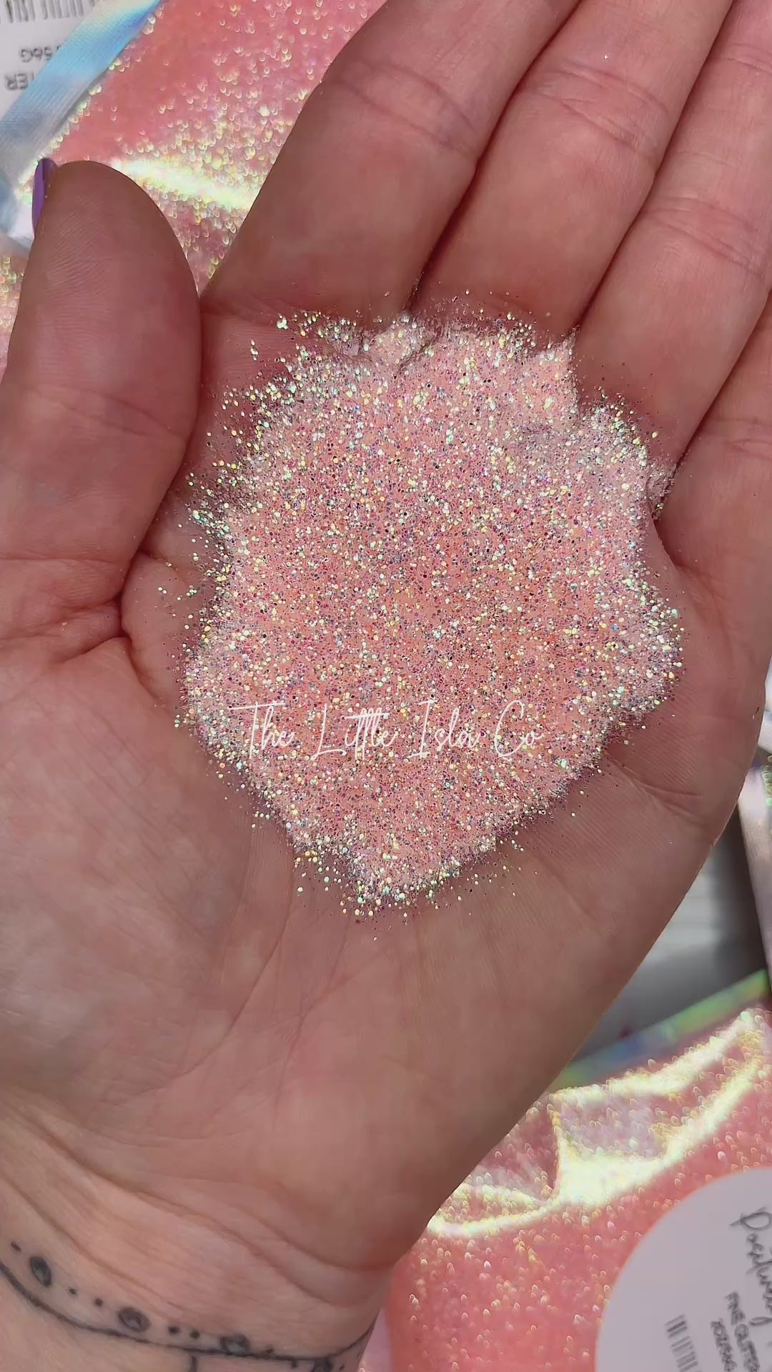 This is a pastel peachy orange fine glitter with an iridescent finish, in a 2oz/56g pack.