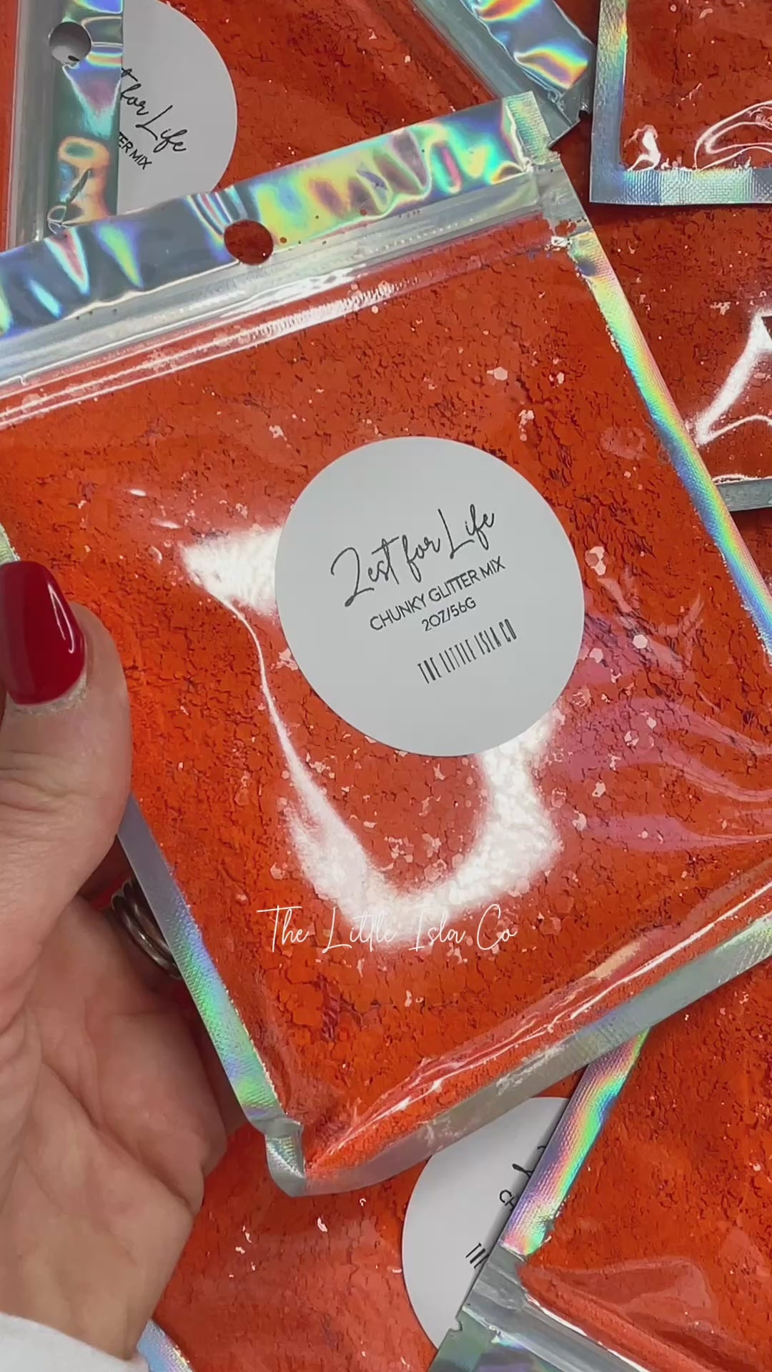 This is a glossy, bright orange chunky glitter mix, in a combination of 3 cut sizes - chunky, fine and ultra-fine glitter.